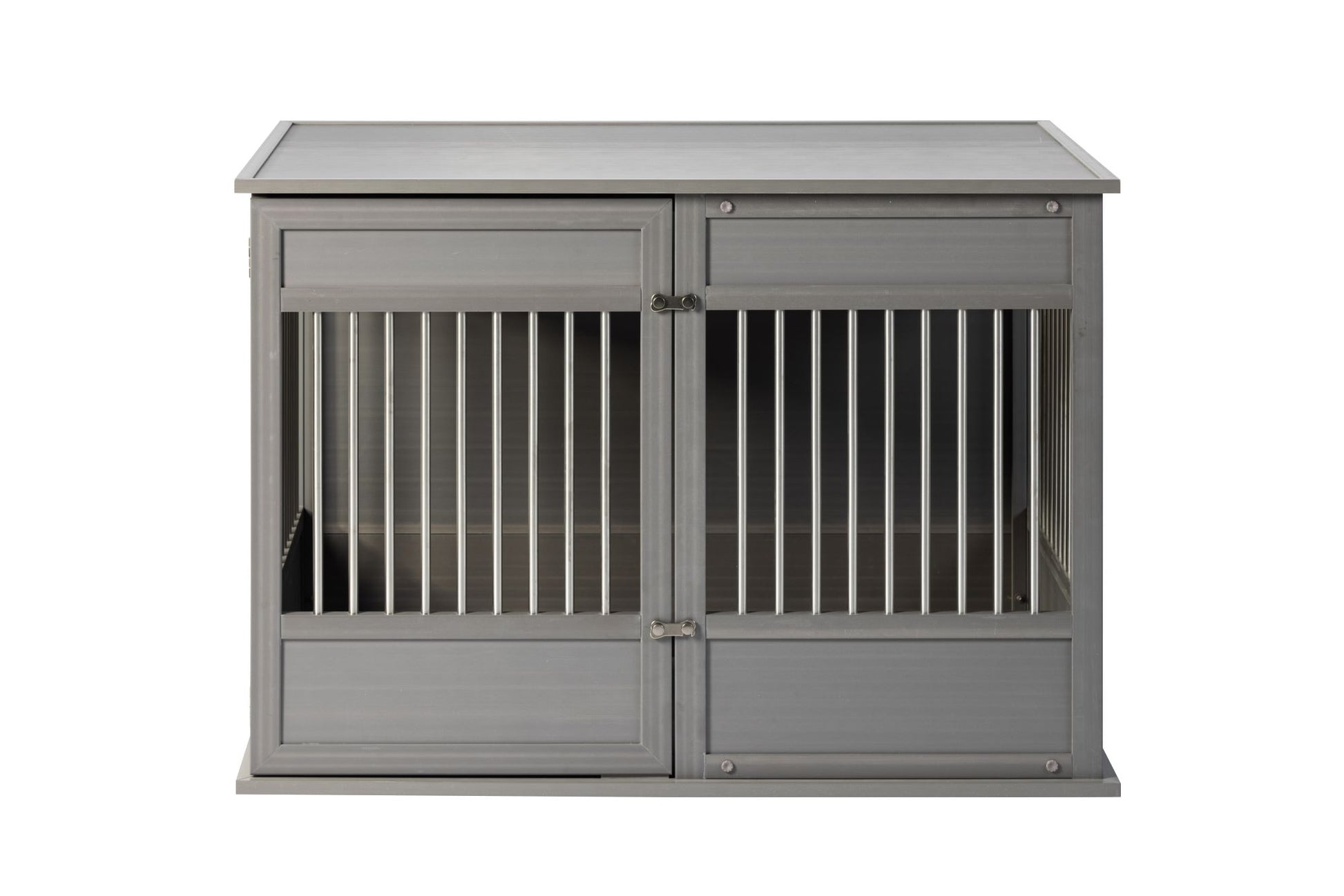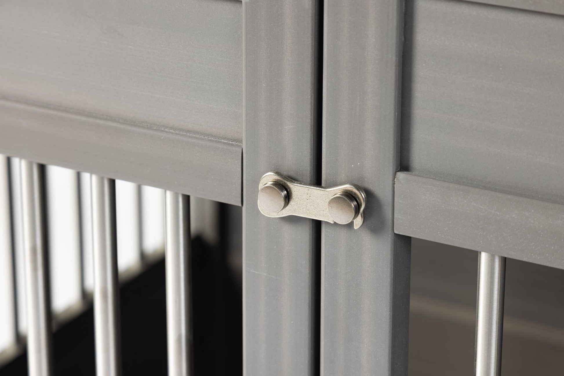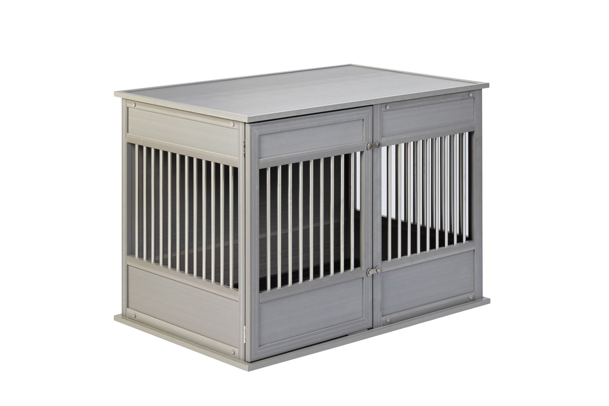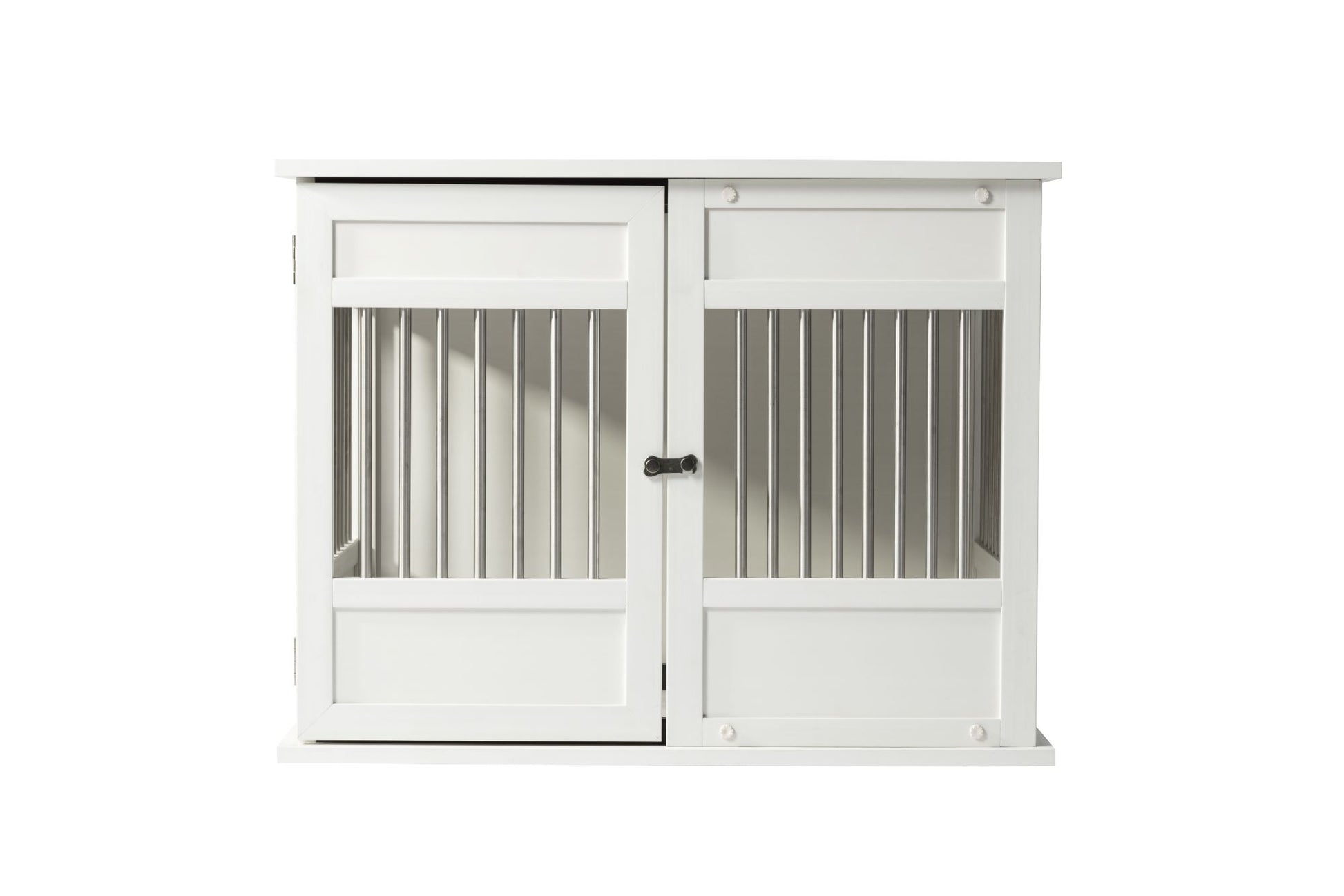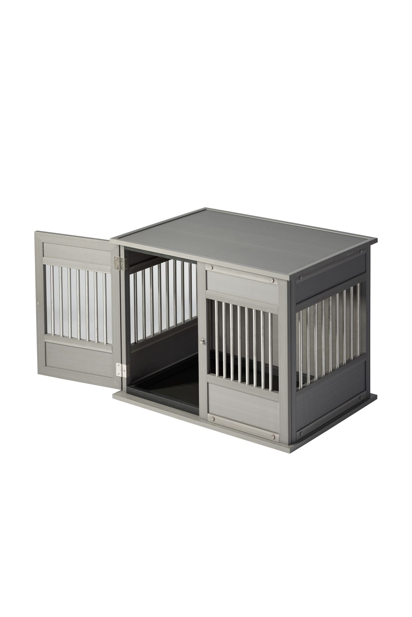 The New Age Pet® Horizon Pet Crate, crafted with durable ECOFLEX®, offers a stylish and functional solution for pet containment. As a variation of the popular InnPlace™ Crate, the Horizon Pet Crate features stainless steel spindles and charming bone-shaped latches. Designed with convenience in mind, the door is positioned on the long side of the crate, providing easy access. Available in three sizes and two colors, this crate complements most home decors while accommodating a wide range of dog breeds. With a 10-year manufacturer's warranty, the Horizon Pet Crate ensures long-lasting quality and peace of mind for pet owners.