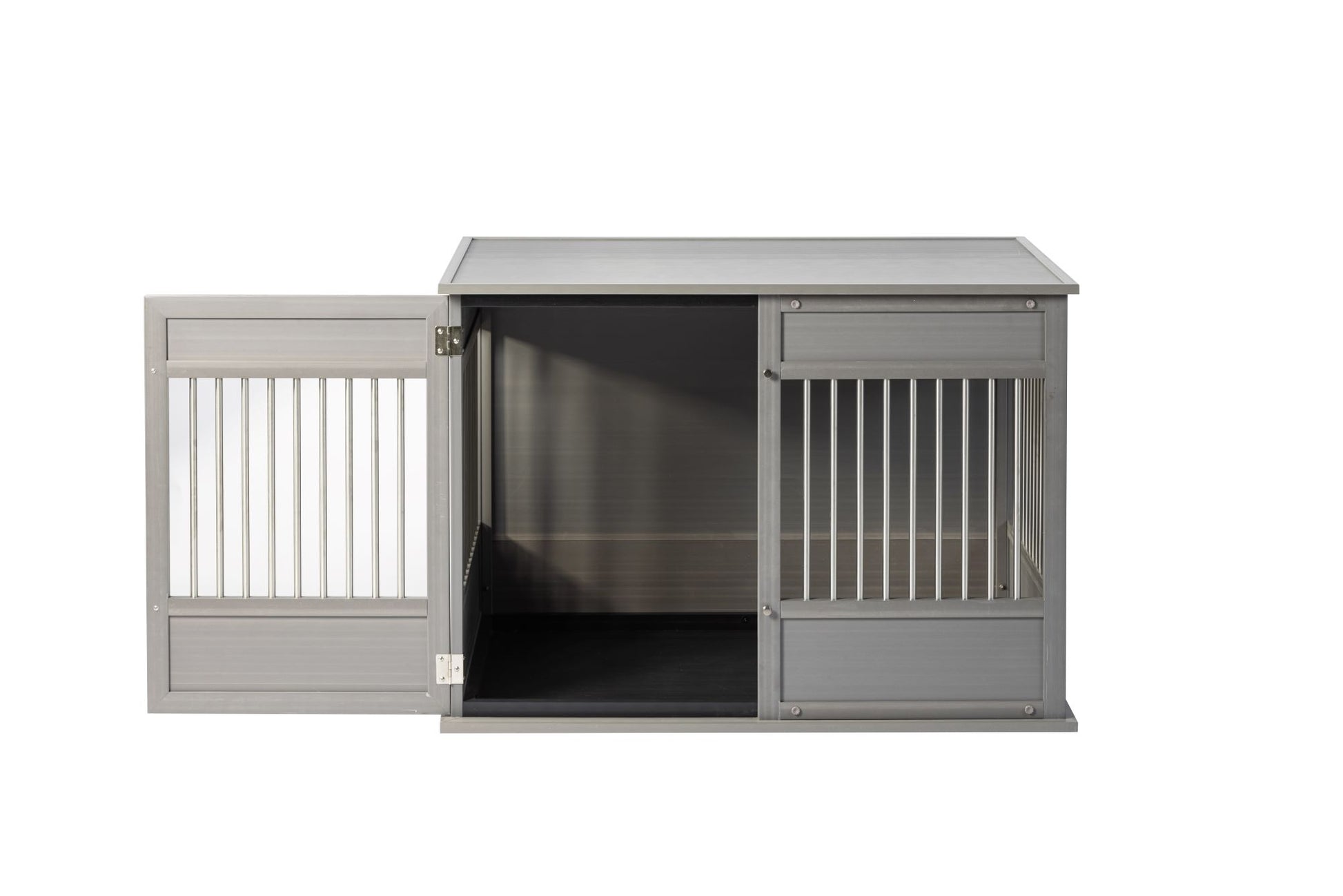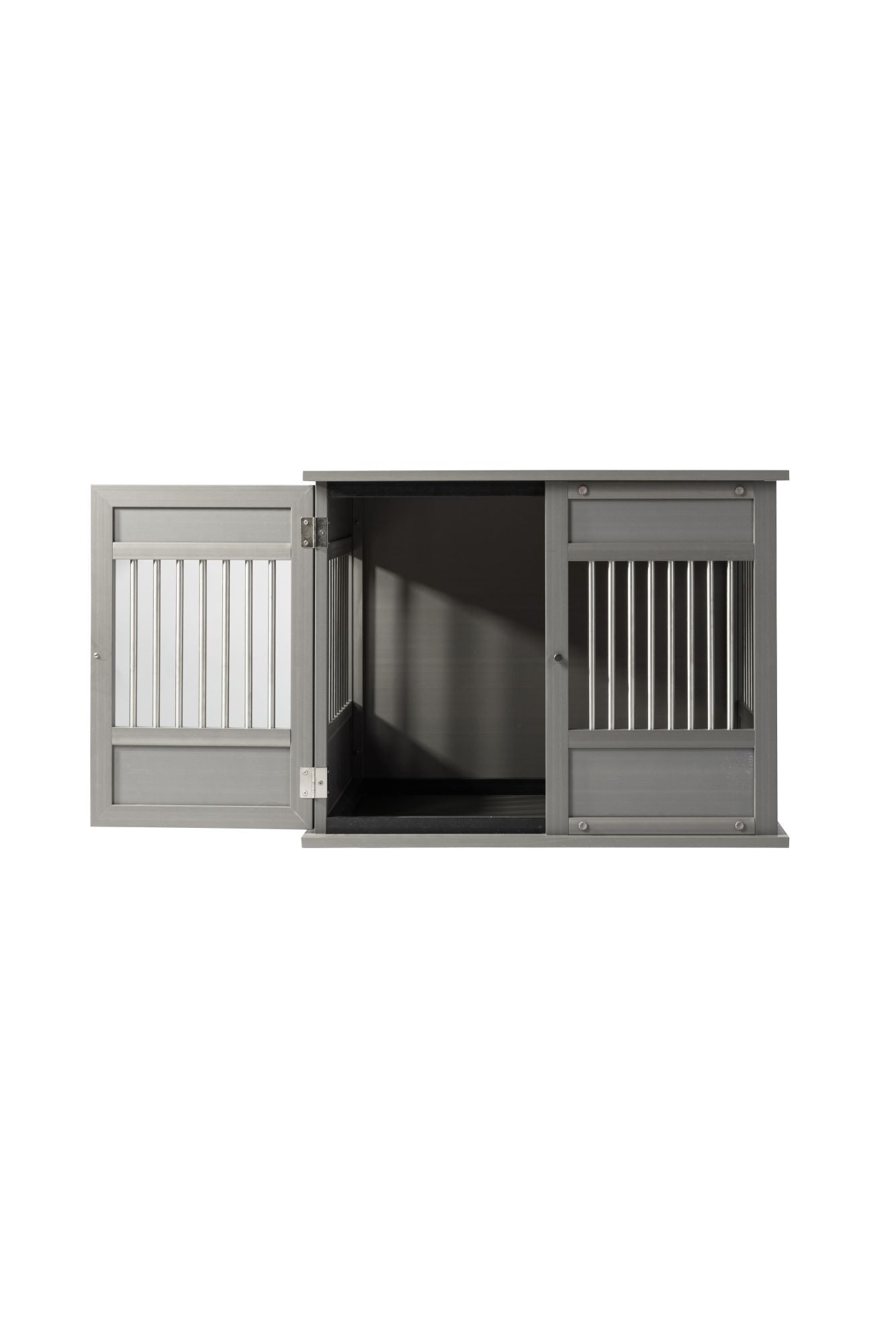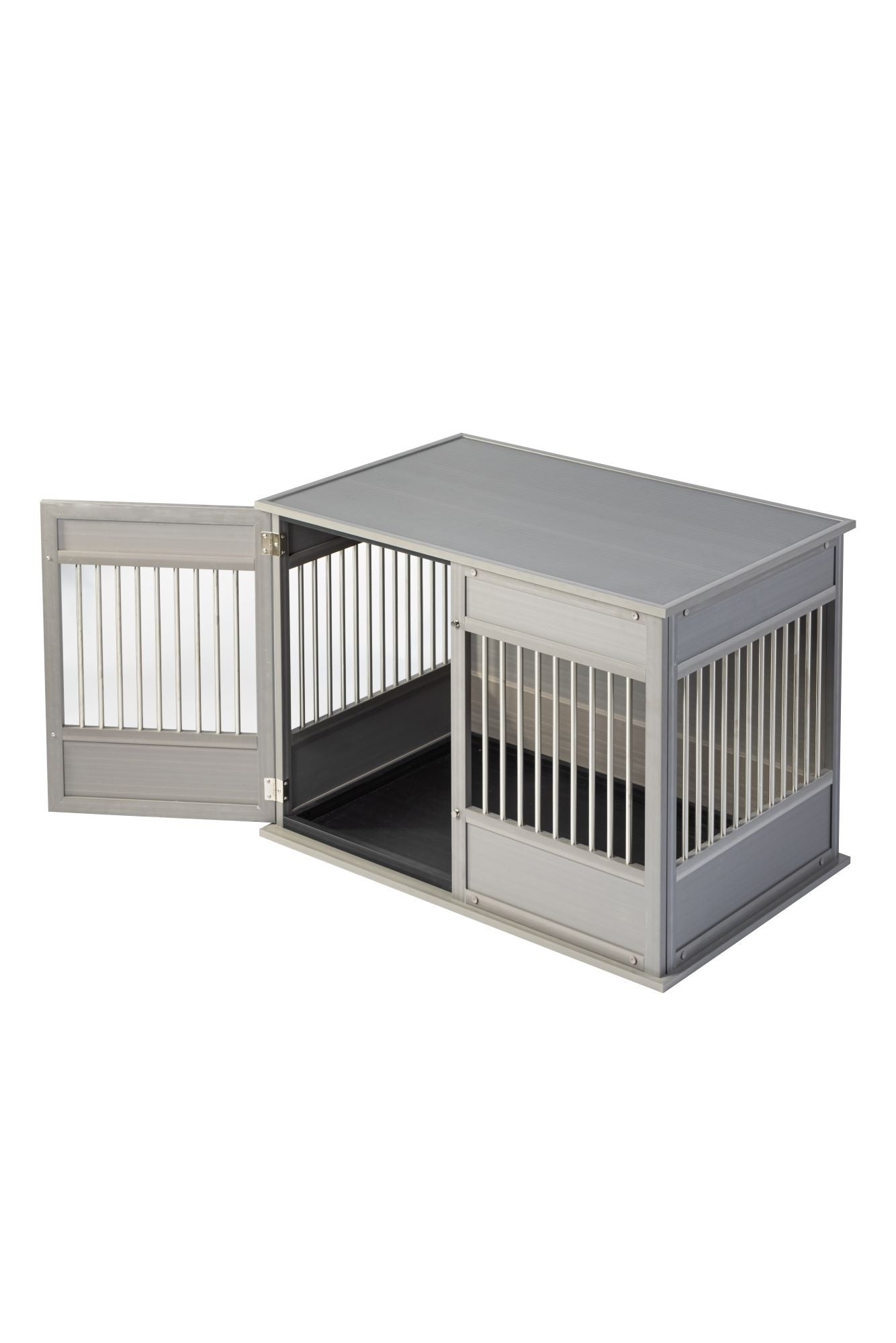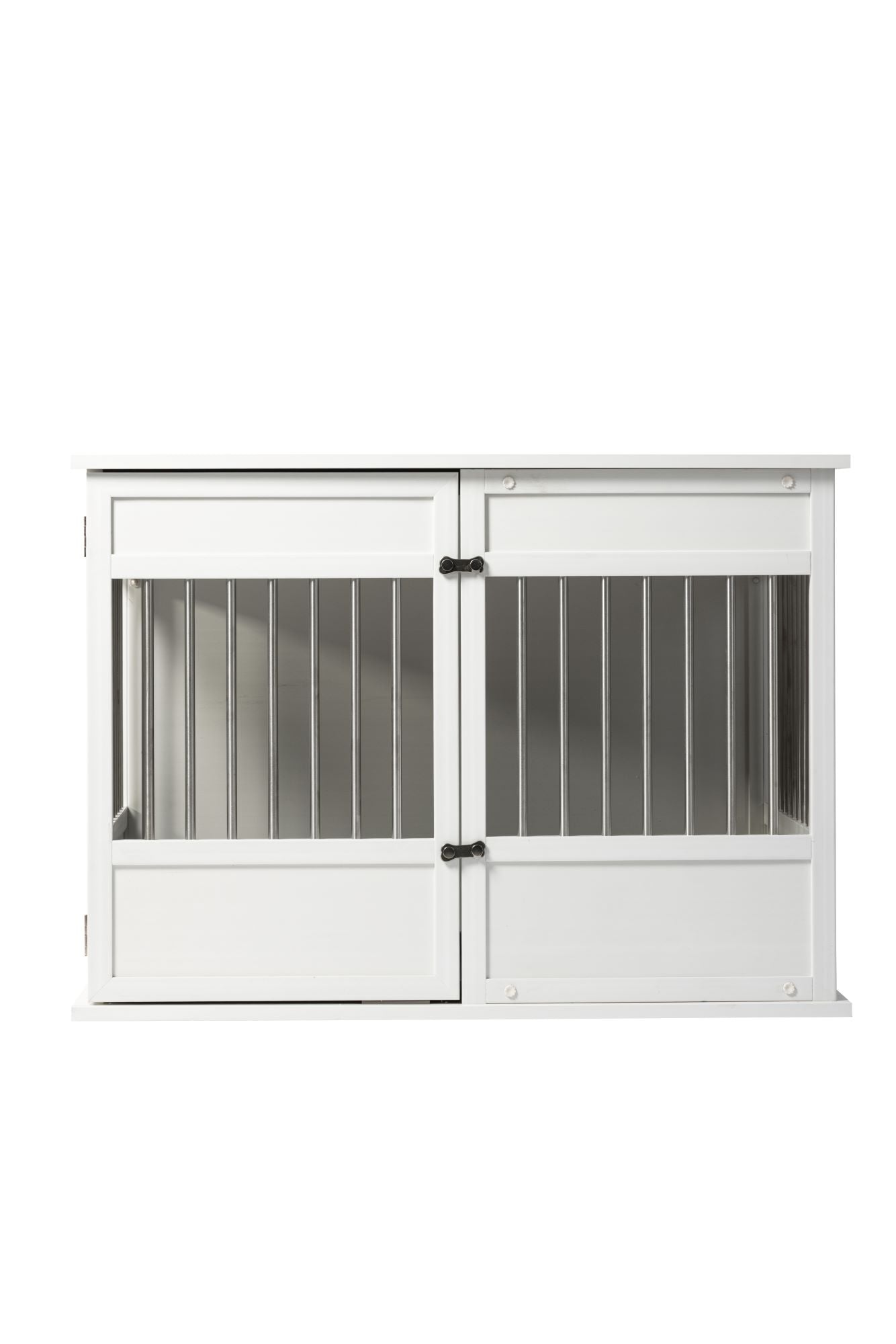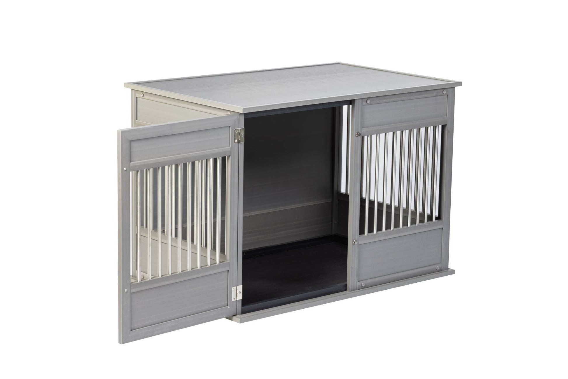 The New Age Pet® Horizon Pet Crate, crafted with durable ECOFLEX®, offers a stylish and functional solution for pet containment. As a variation of the popular InnPlace™ Crate, the Horizon Pet Crate features stainless steel spindles and charming bone-shaped latches. Designed with convenience in mind, the door is positioned on the long side of the crate, providing easy access. Available in three sizes and two colors, this crate complements most home decors while accommodating a wide range of dog breeds. With a 10-year manufacturer's warranty, the Horizon Pet Crate ensures long-lasting quality and peace of mind for pet owners.