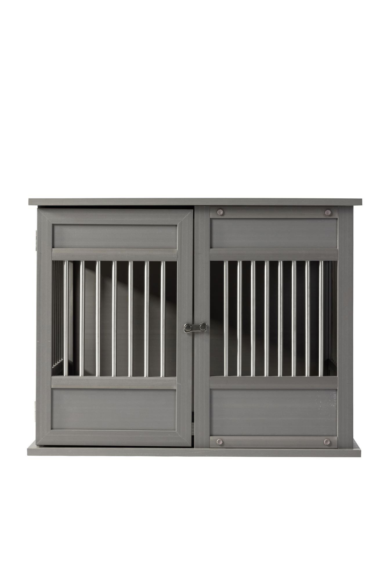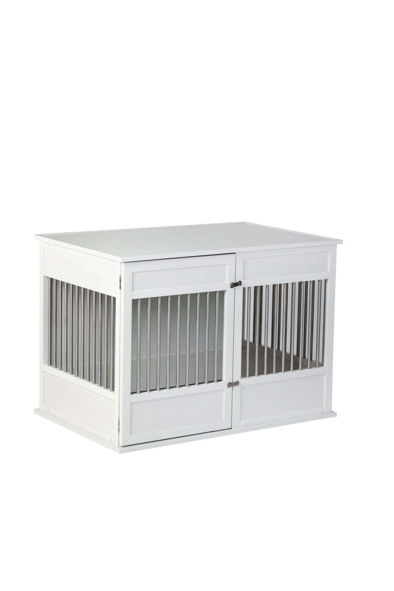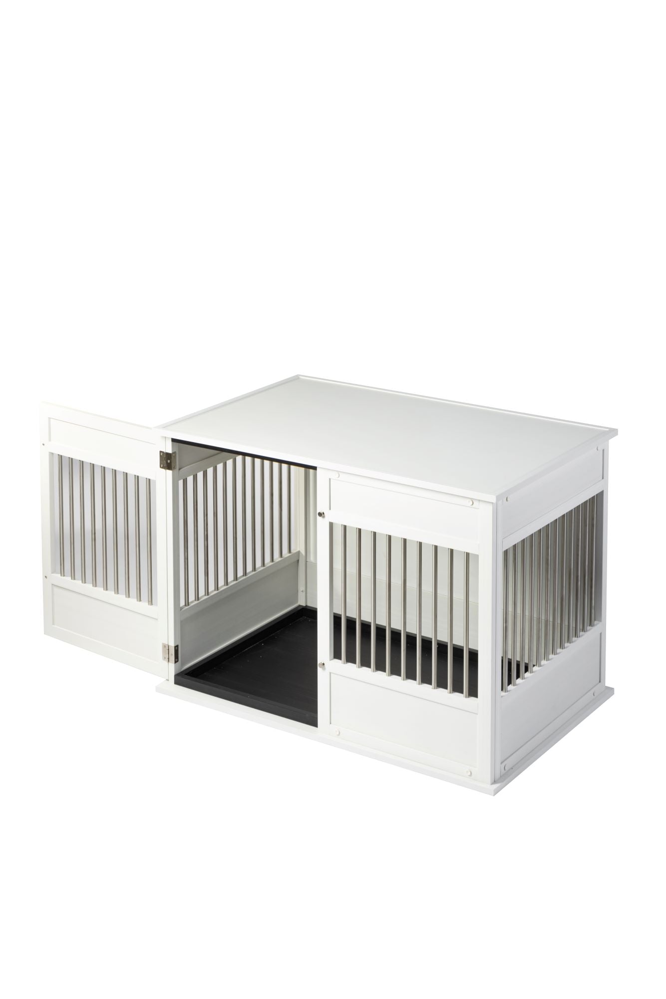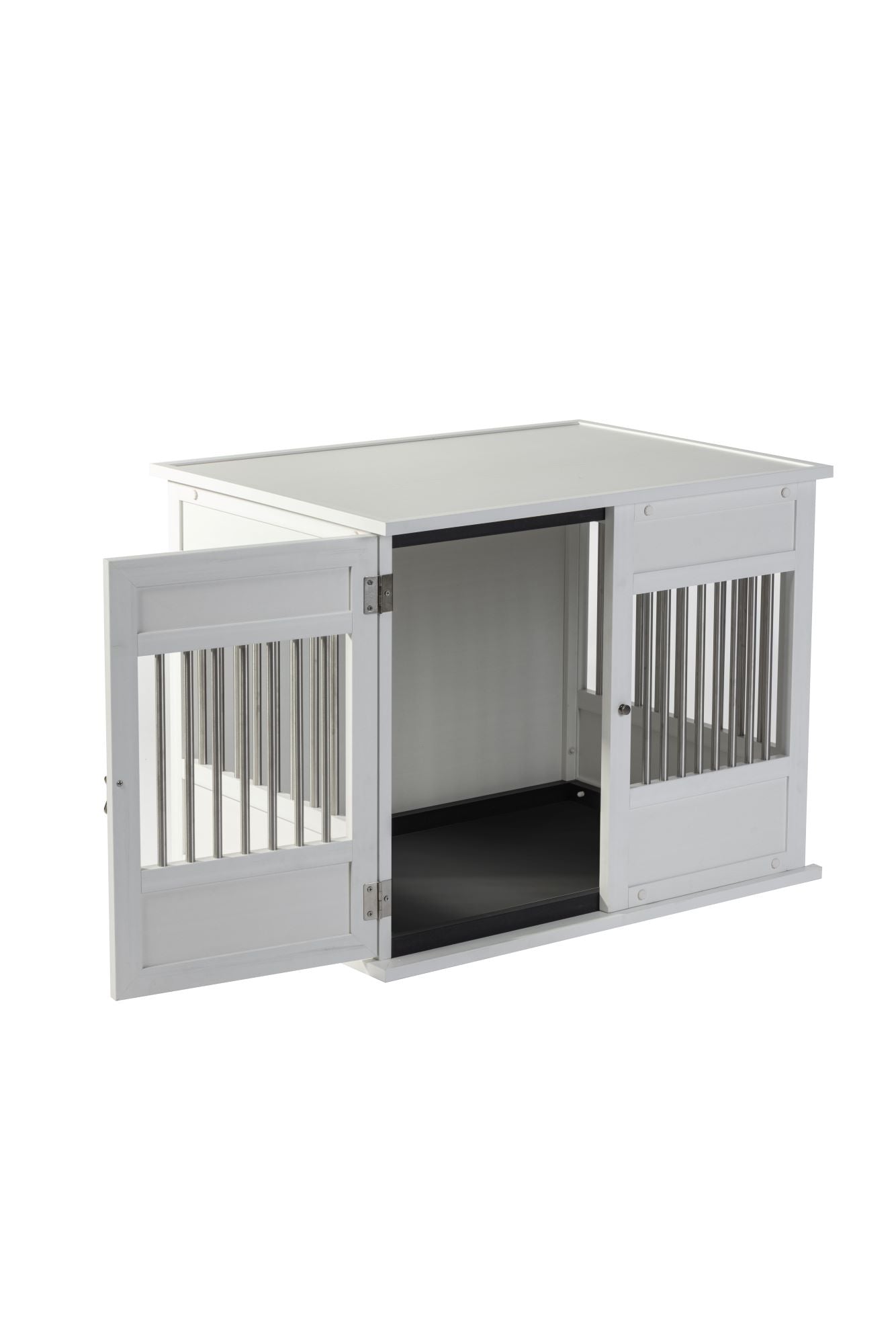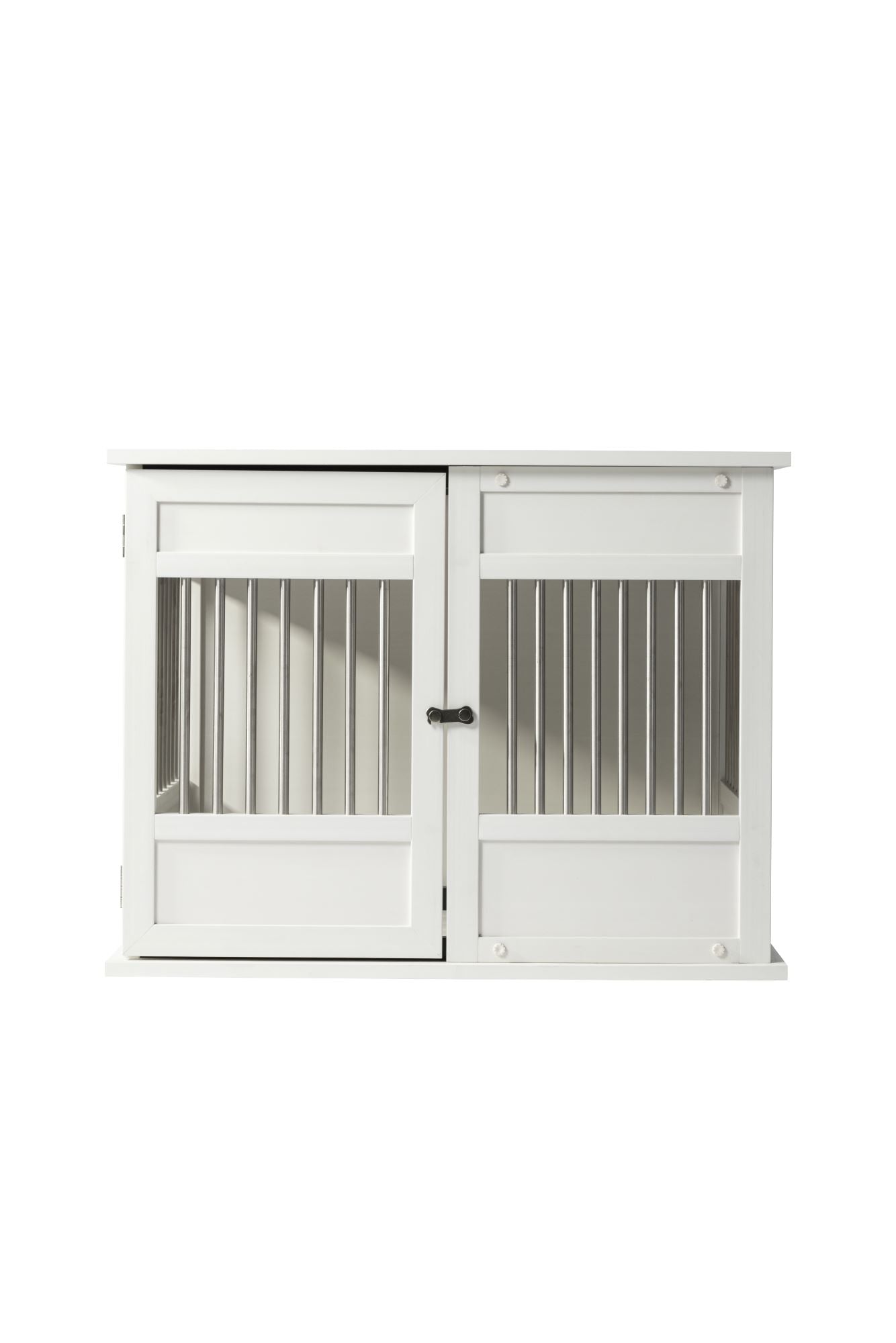 The New Age Pet® Horizon Pet Crate, crafted with durable ECOFLEX®, offers a stylish and functional solution for pet containment. As a variation of the popular InnPlace™ Crate, the Horizon Pet Crate features stainless steel spindles and charming bone-shaped latches. Designed with convenience in mind, the door is positioned on the long side of the crate, providing easy access. Available in three sizes and two colors, this crate complements most home decors while accommodating a wide range of dog breeds. With a 10-year manufacturer's warranty, the Horizon Pet Crate ensures long-lasting quality and peace of mind for pet owners.