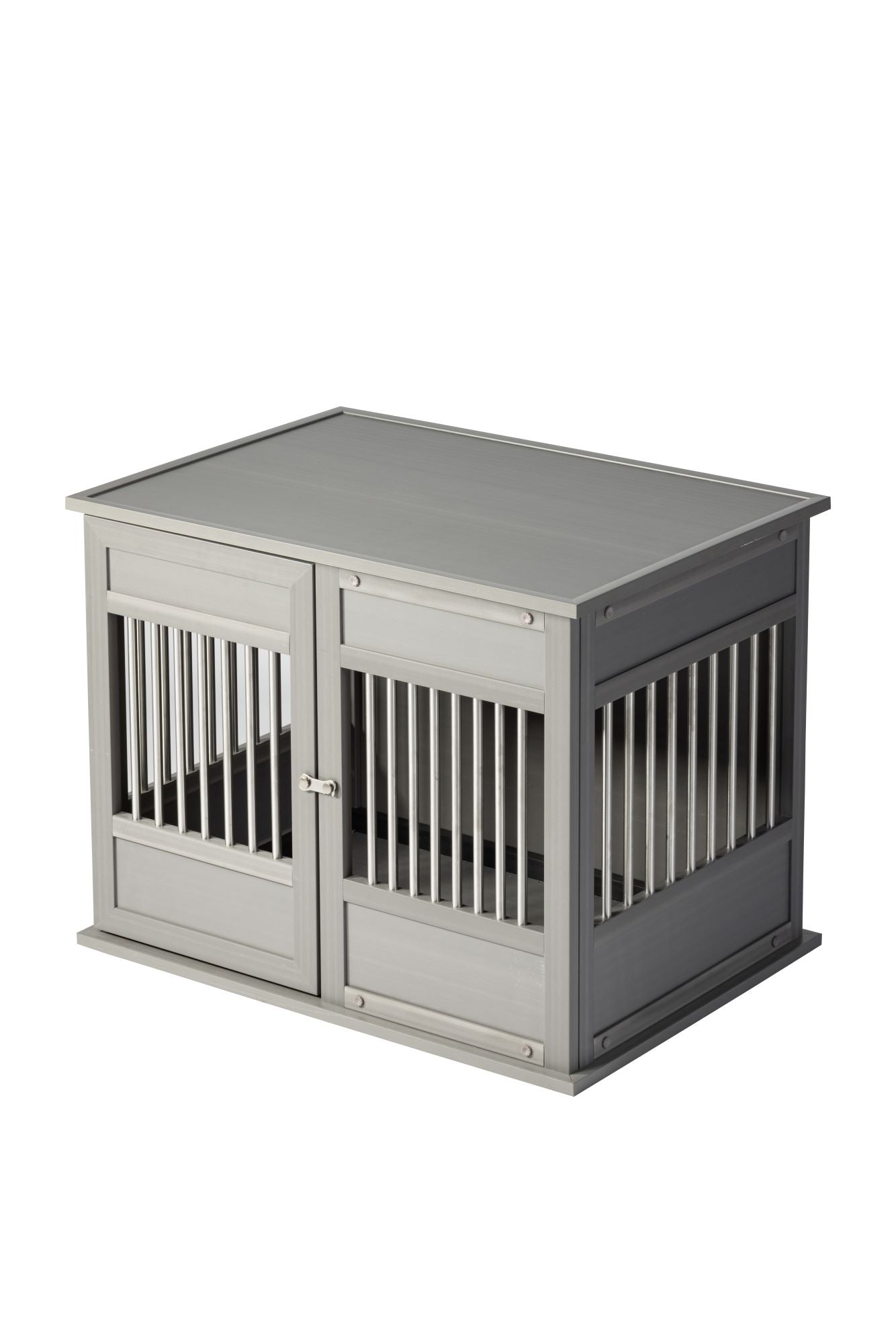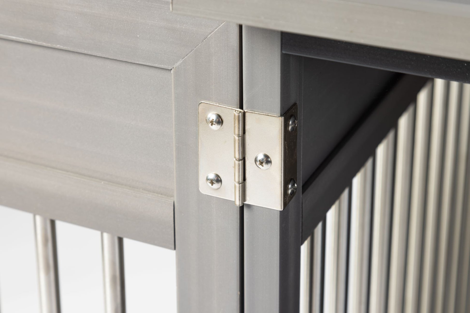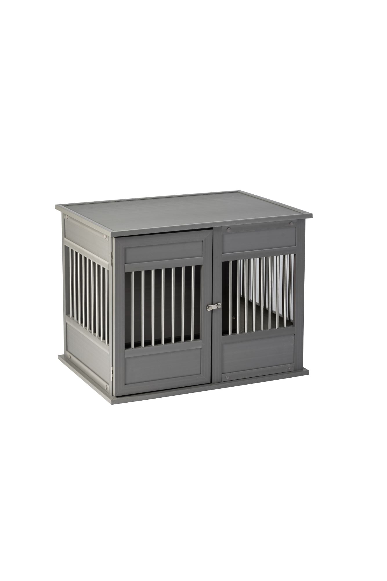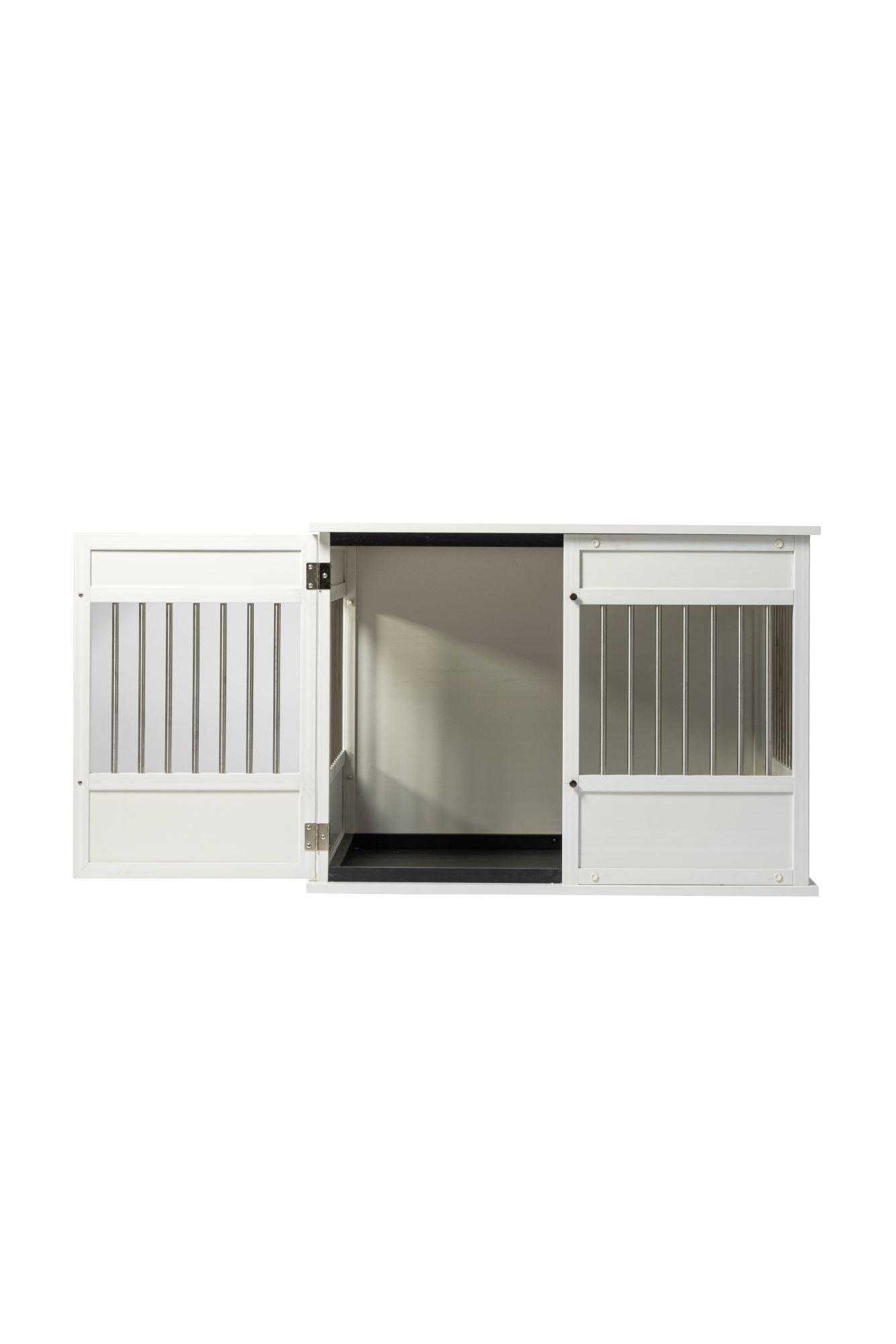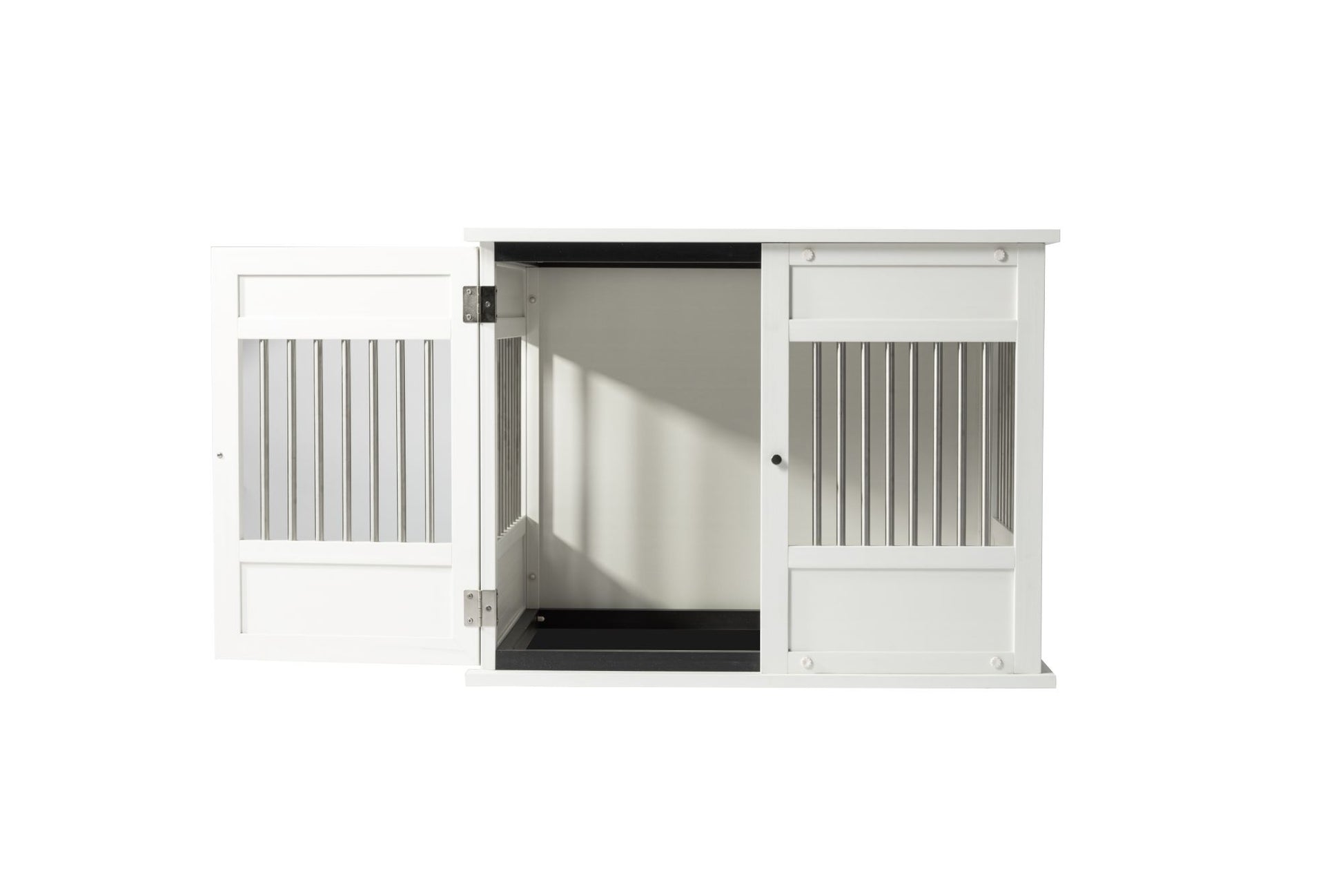 The New Age Pet® Horizon Pet Crate, crafted with durable ECOFLEX®, offers a stylish and functional solution for pet containment. As a variation of the popular InnPlace™ Crate, the Horizon Pet Crate features stainless steel spindles and charming bone-shaped latches. Designed with convenience in mind, the door is positioned on the long side of the crate, providing easy access. Available in three sizes and two colors, this crate complements most home decors while accommodating a wide range of dog breeds. With a 10-year manufacturer's warranty, the Horizon Pet Crate ensures long-lasting quality and peace of mind for pet owners.