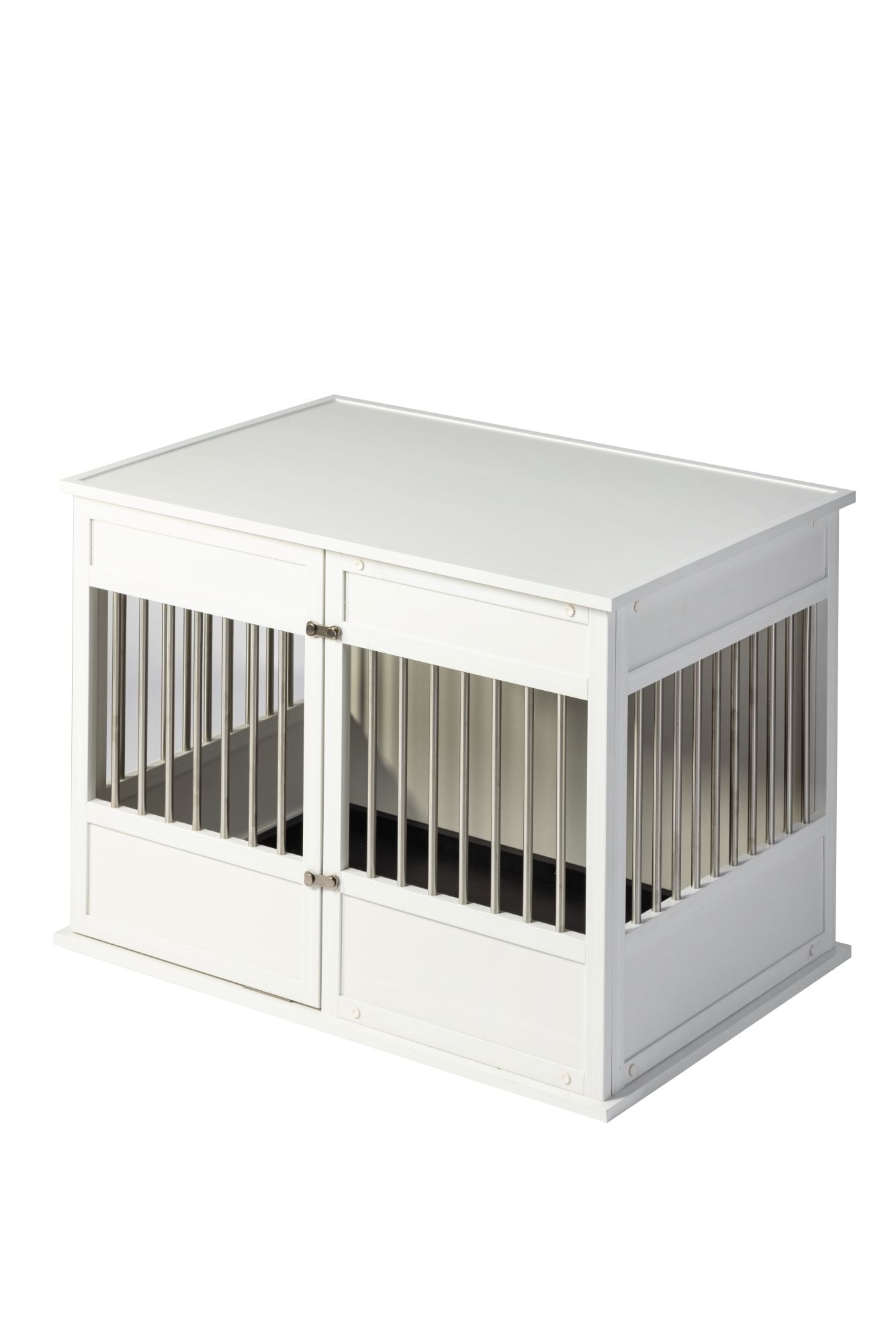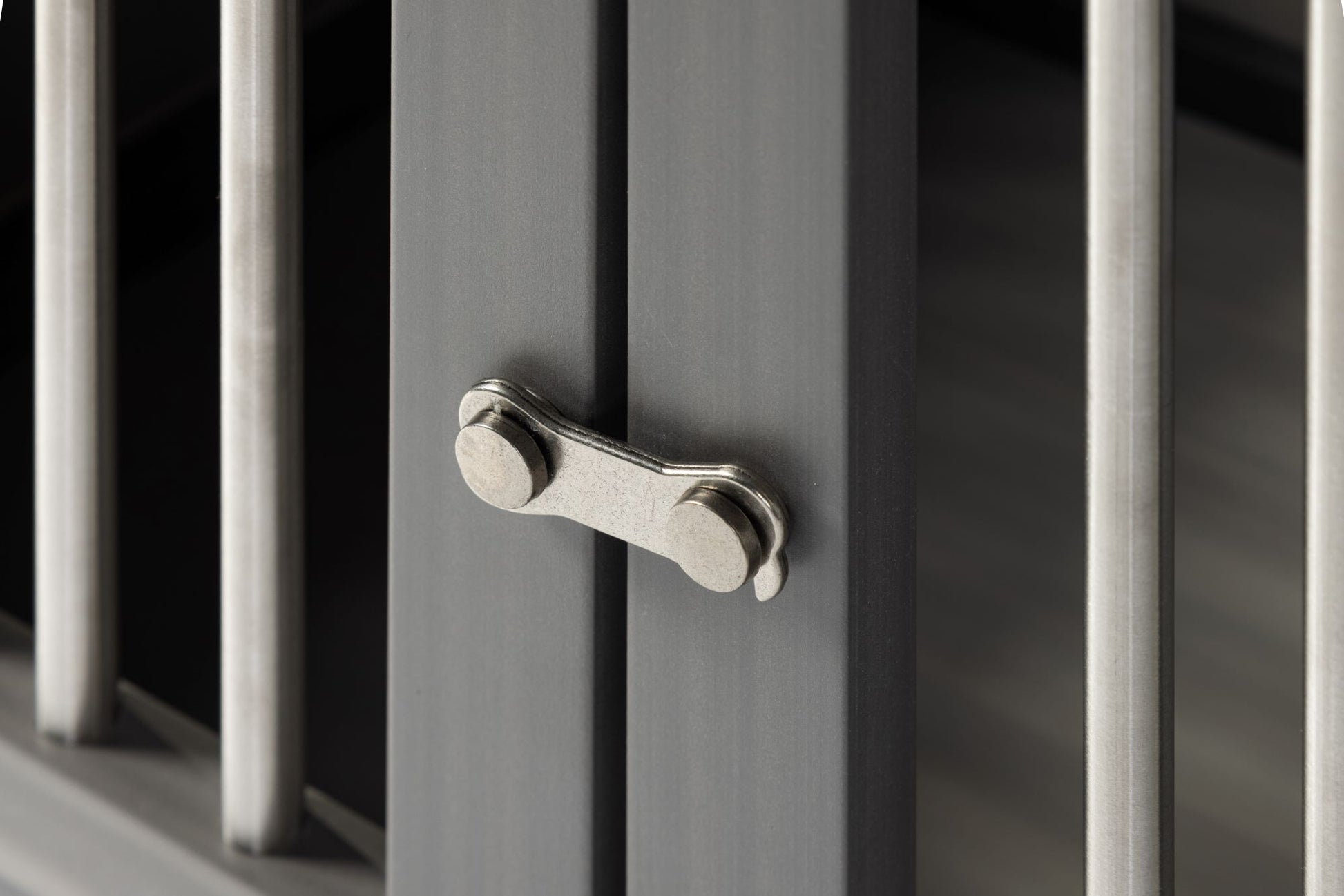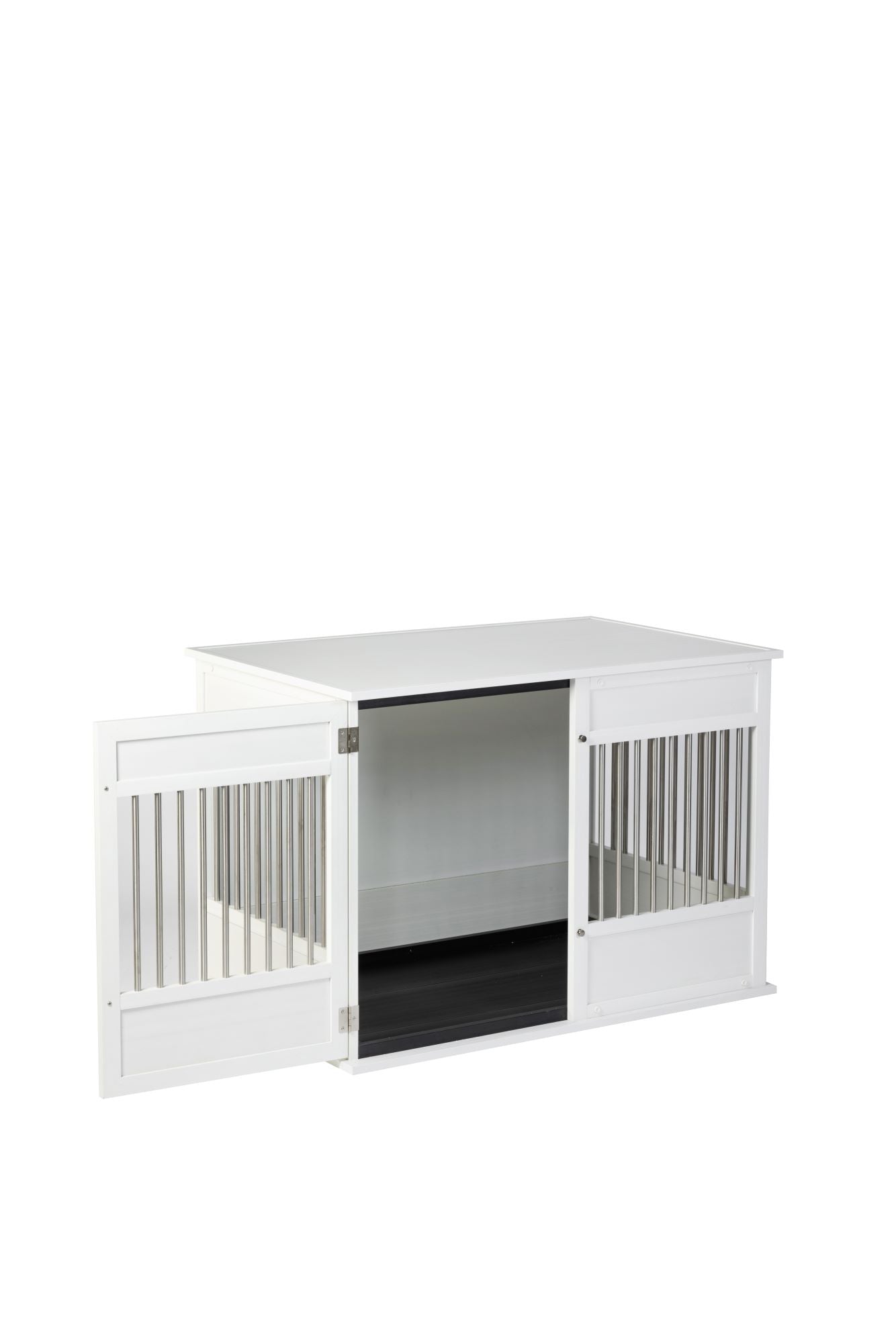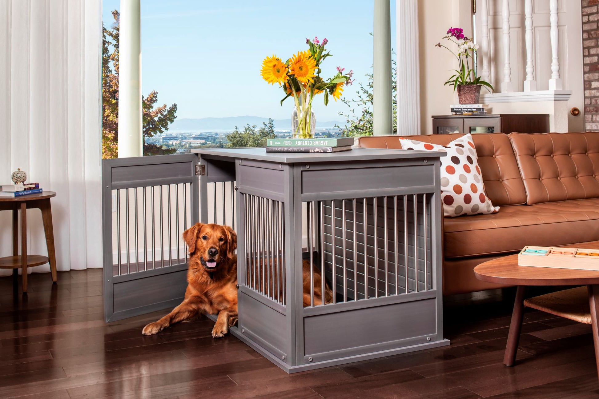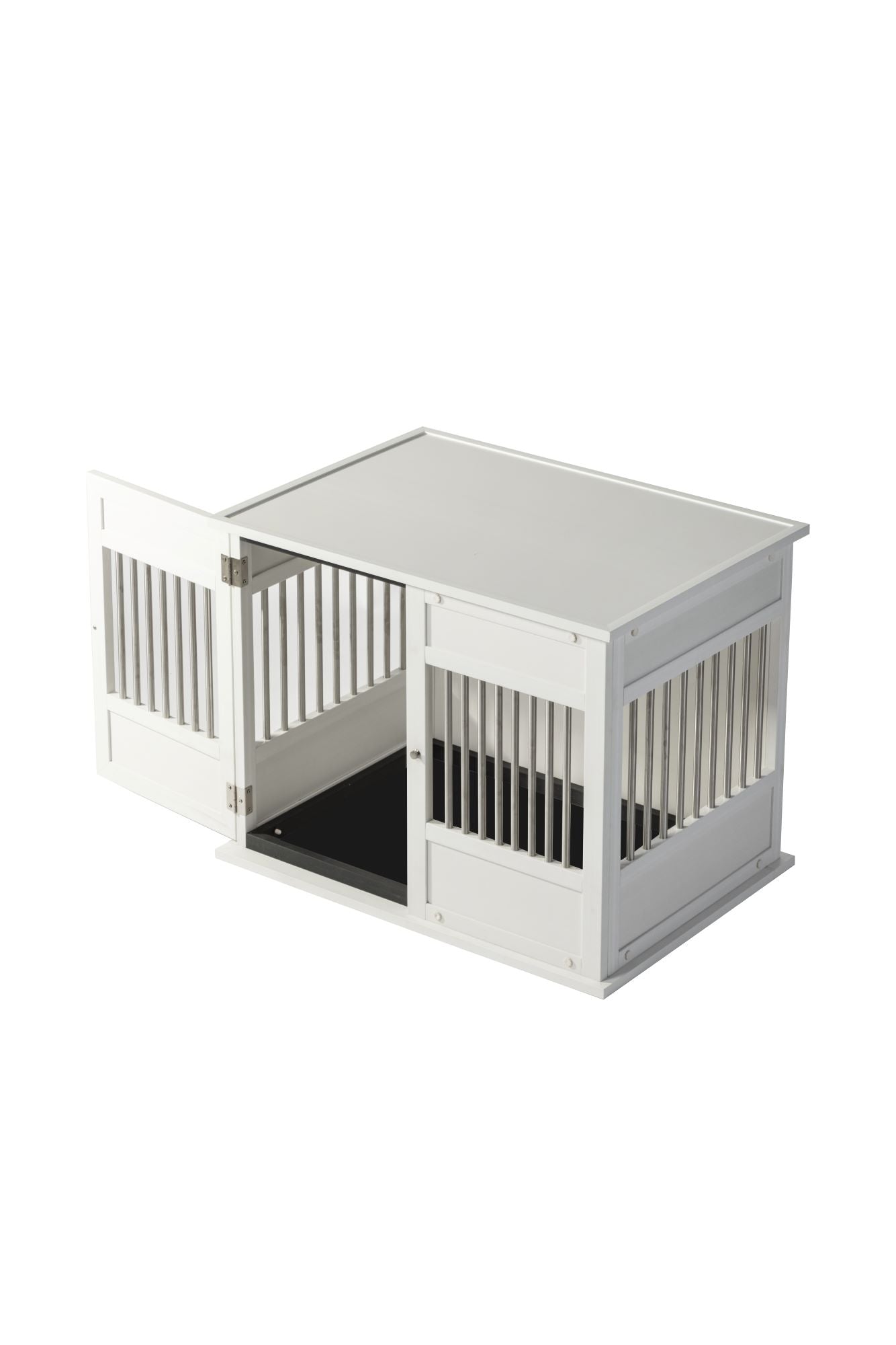 The New Age Pet® Horizon Pet Crate, crafted with durable ECOFLEX®, offers a stylish and functional solution for pet containment. As a variation of the popular InnPlace™ Crate, the Horizon Pet Crate features stainless steel spindles and charming bone-shaped latches. Designed with convenience in mind, the door is positioned on the long side of the crate, providing easy access. Available in three sizes and two colors, this crate complements most home decors while accommodating a wide range of dog breeds. With a 10-year manufacturer's warranty, the Horizon Pet Crate ensures long-lasting quality and peace of mind for pet owners.