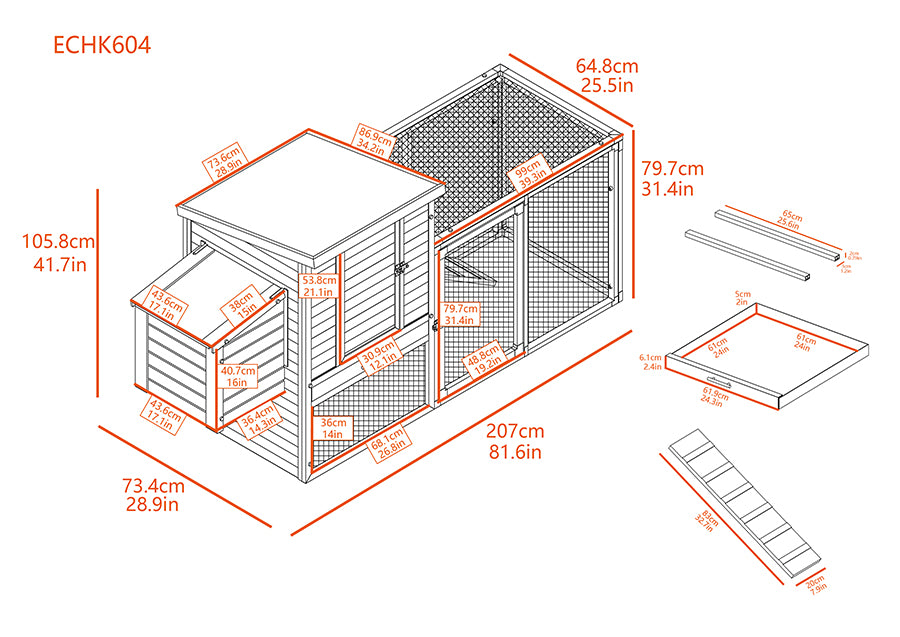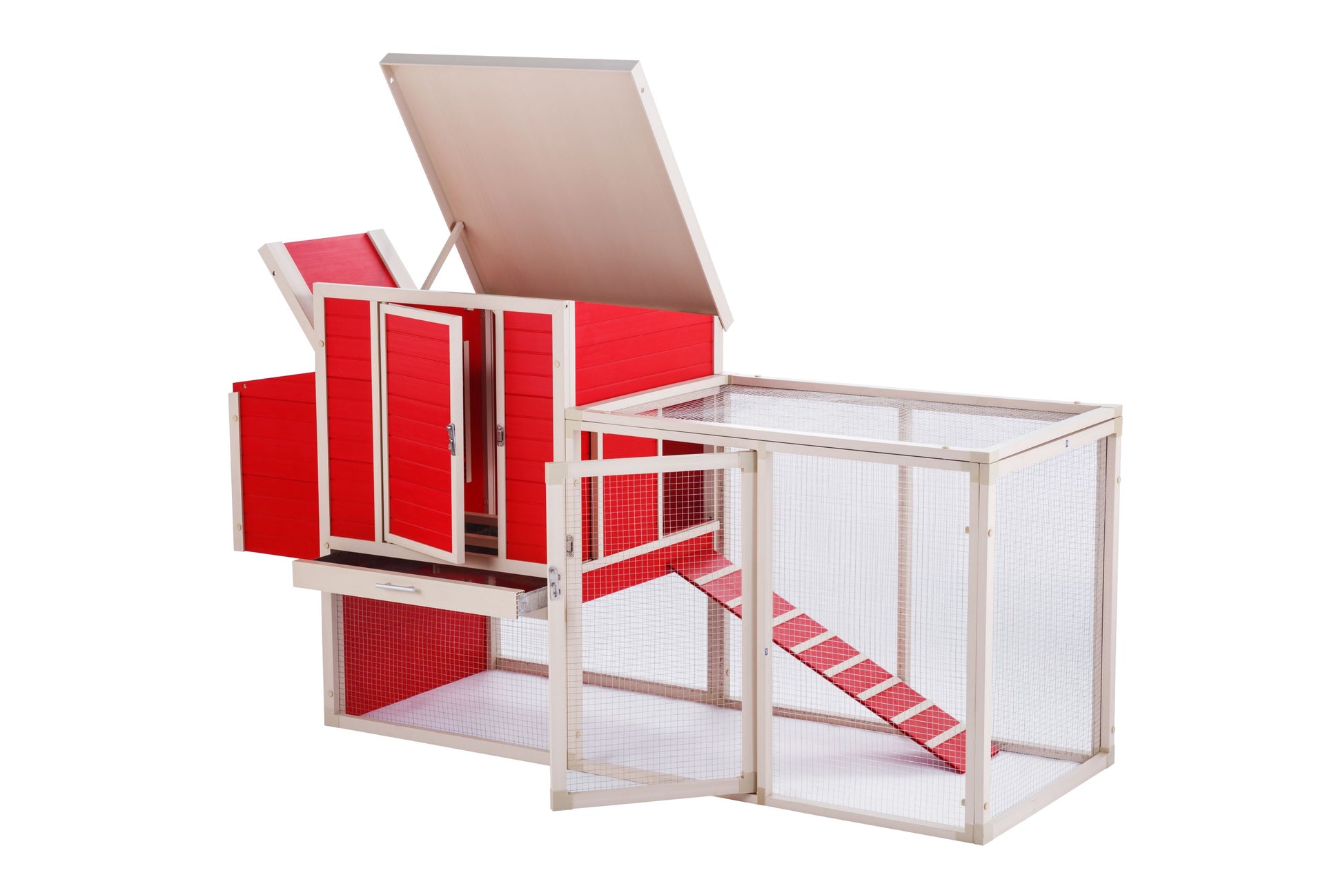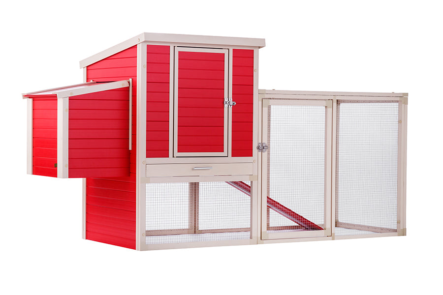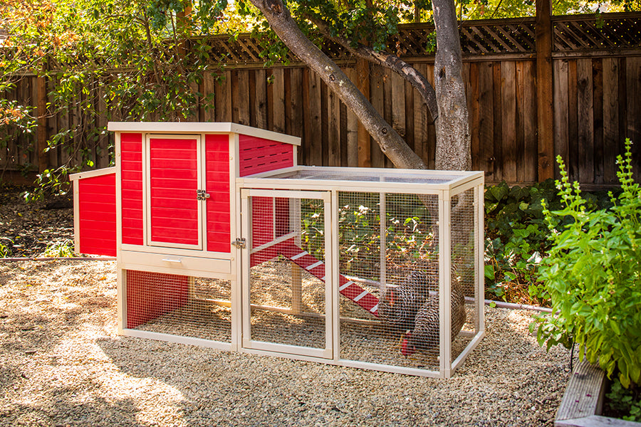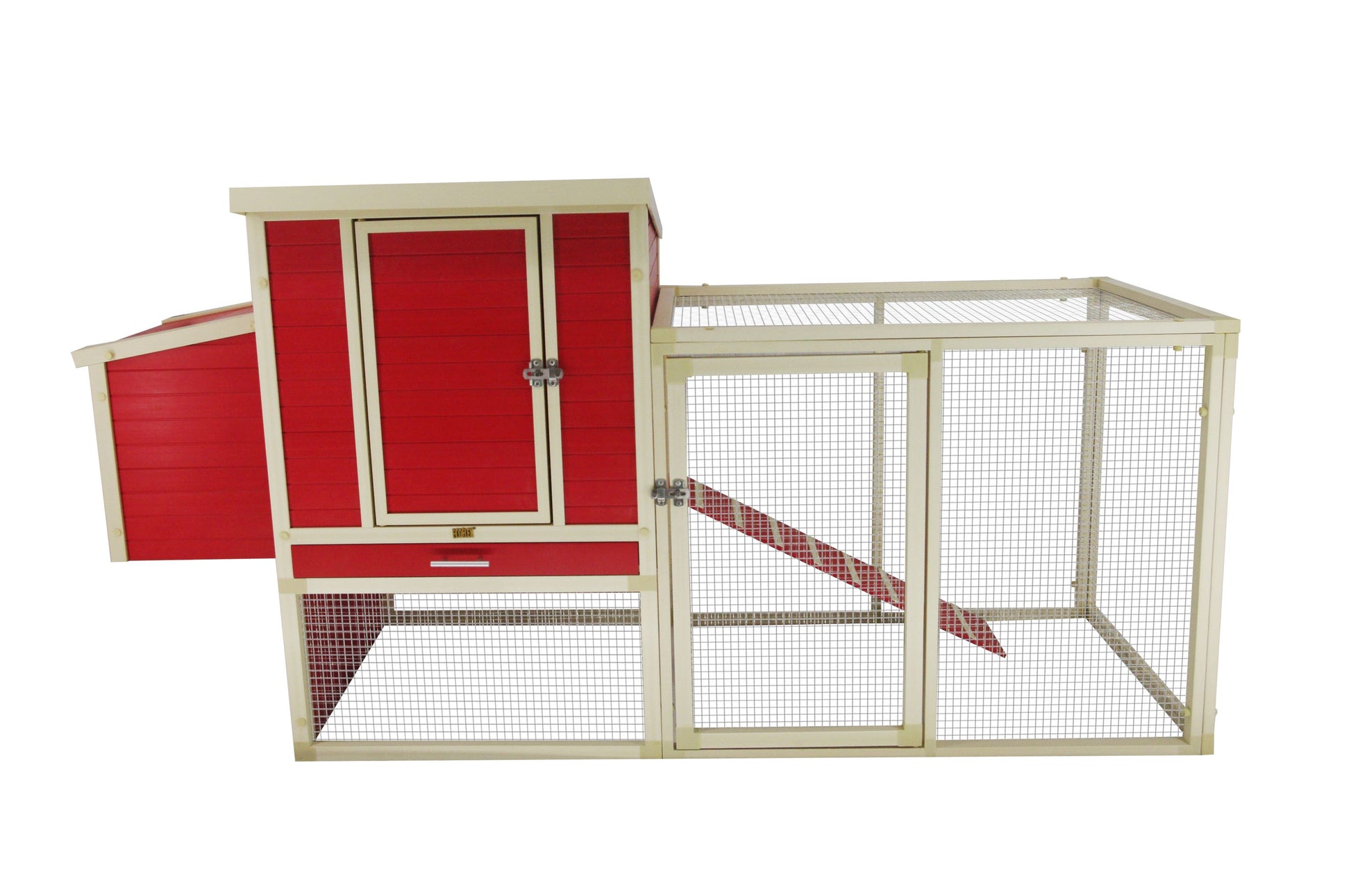 The New Age Pet® Sonoma Chicken Coop is made with ECOFLEX®, a proprietary composite blend of recycled polymers and reclaimed wood fiber by-products. The ECOFLEX® material is non-toxic, eco-friendly and impervious to moisture and odor, making it the perfect material to keep your flock happy and healthy. All New Age Pet® outdoor products are backed by an unrivaled 10-year limited manufacturer warranty. This coop features 2 levels of living space with built in ventilation, a nesting box with hinged lid for easy egg collecting, 2 roosting bars and an easy to clean, galvanized pull out tray. The top level has 2 doors, one opens to the main coop while the other allows access to the ramp to the ground level pen, which is open to the ground, so your flock has access to a shaded and grassy area. The pen area has one door and is constructed using NeverRust™ stainless steel wire mesh for years of worry-free use. Nesting box and outer doors feature predator resistant locks. New Age Pet® products are easy to assemble, easy to clean and easy to LOVE!