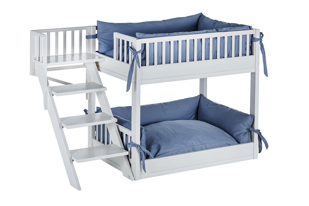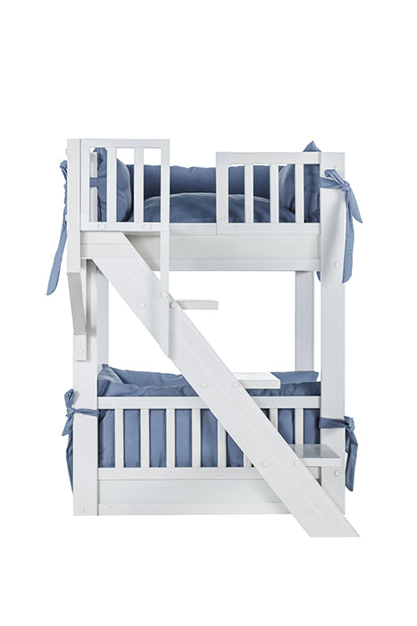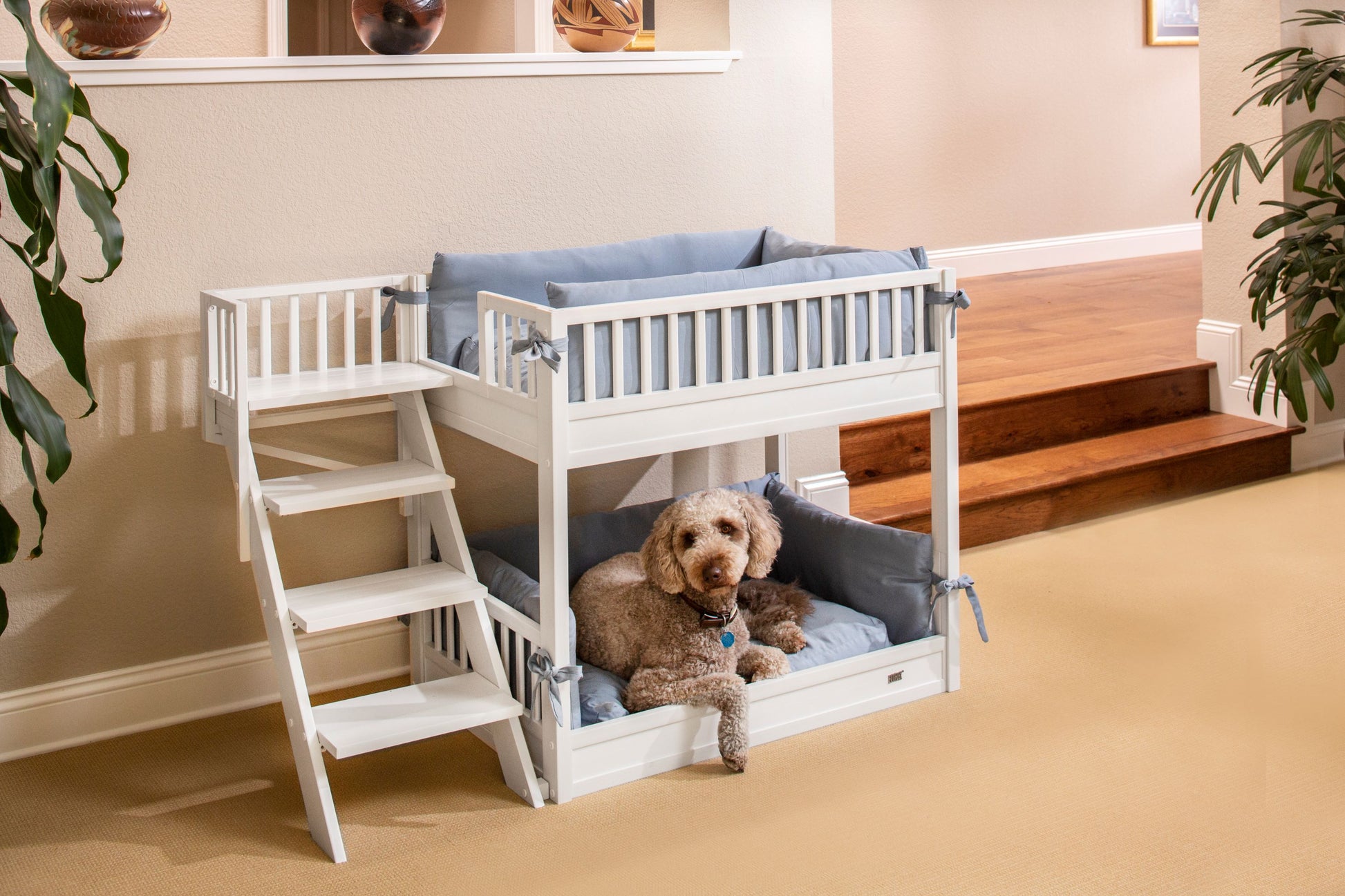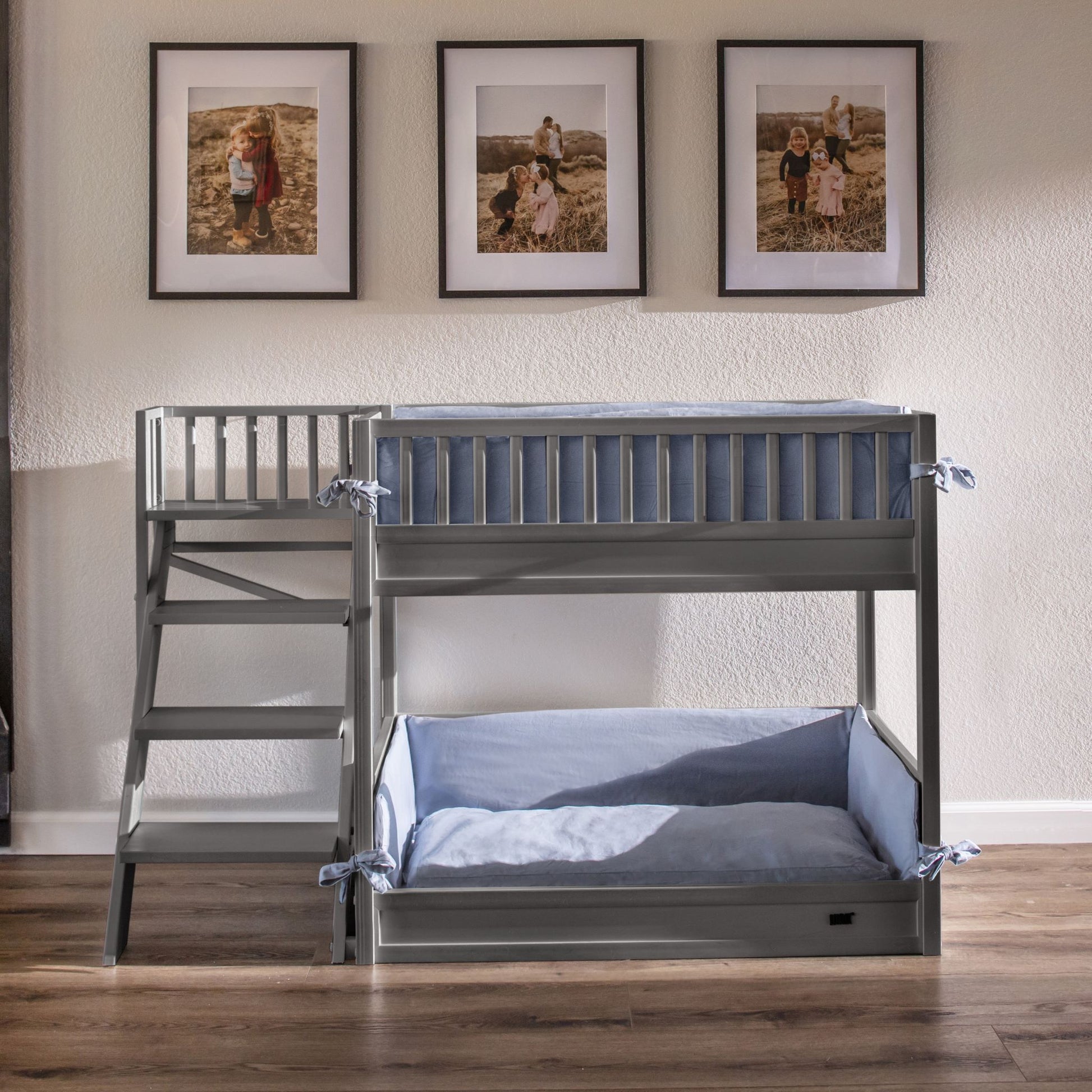 The New Age Pet® Aspen Bunk Bed is made with ECOFLEX®, a proprietary composite blend of recycled polymers and reclaimed wood fiber by-products. The ECOFLEX® material is non-toxic, eco-friendly and impervious to moisture and odor, making it the perfect material for your pets’ furniture. All New Age Pet® furniture is backed by a 10-year limited manufacturer warranty. The days of your pups fighting over the bed is a thing of the past with our Aspen Pet Bunk Bed. Perfect for homes with multiple pets, these bunk beds can accommodate 2 large dogs or 3+ small dogs. Comes with two memory foam cluster cushions with removable covers. Available in Antique White and Gray. New Age Pet® products are easy to assemble, easy to clean and easy to LOVE!