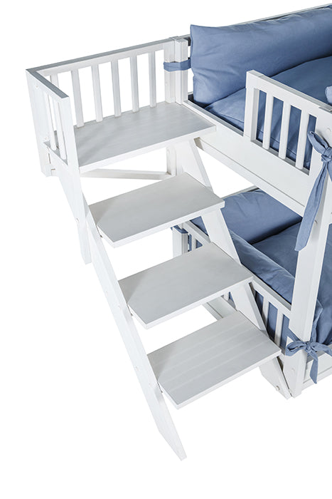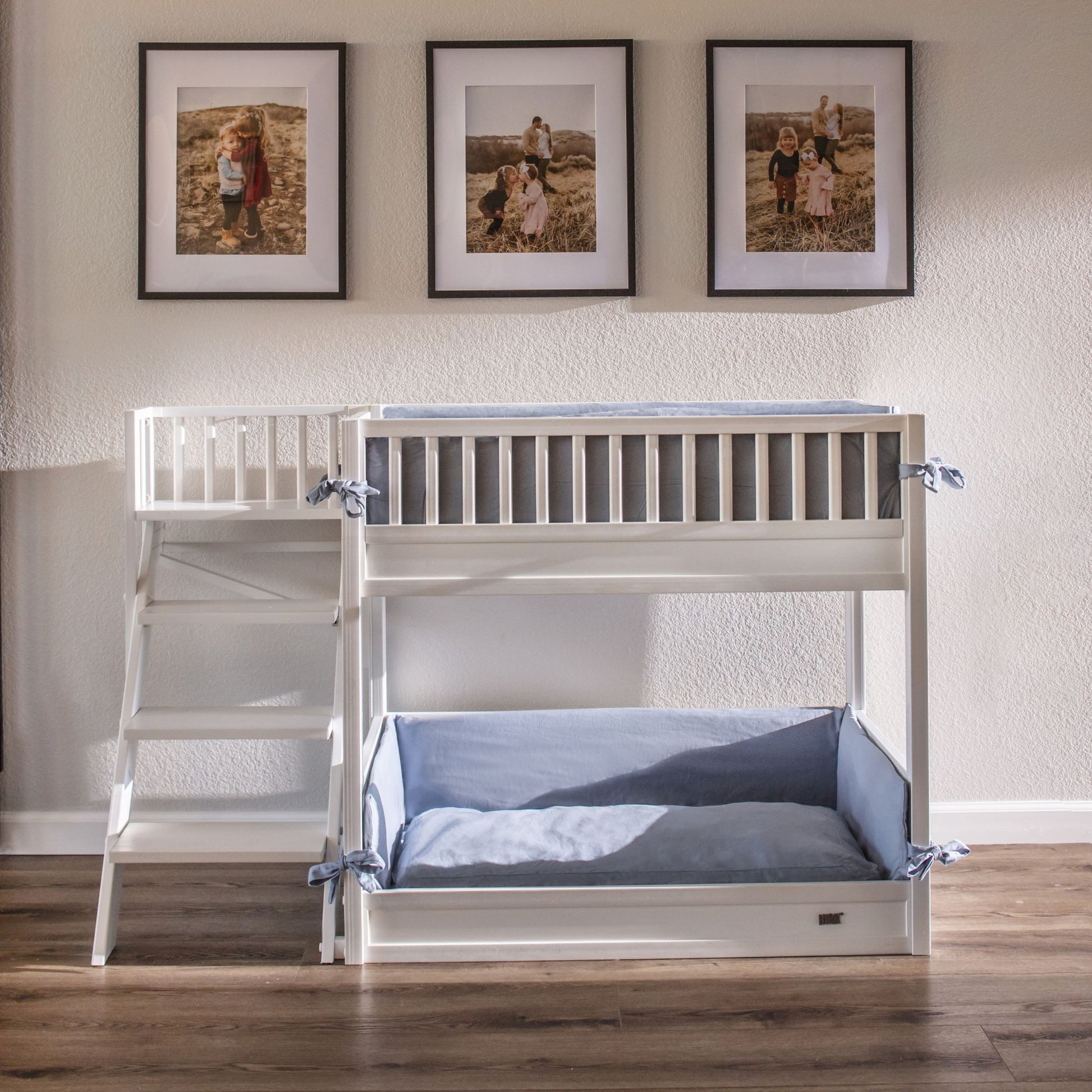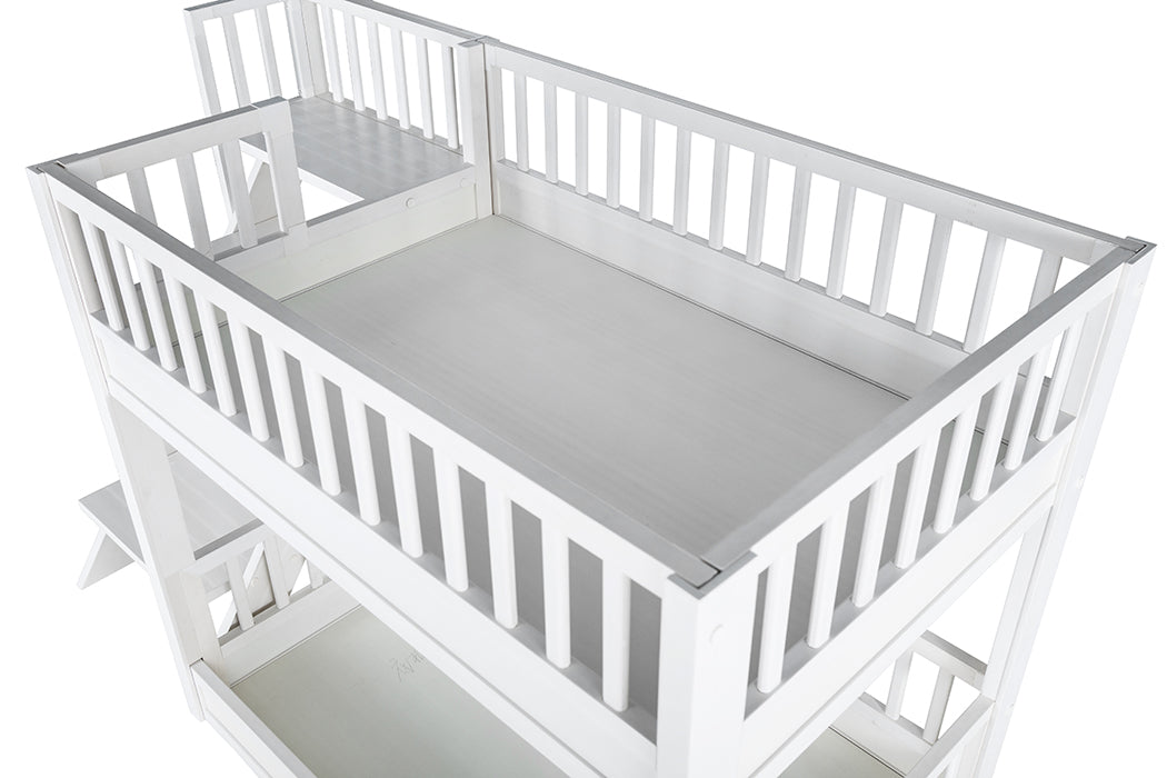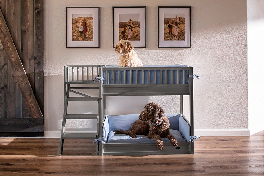 The New Age Pet® Aspen Bunk Bed is made with ECOFLEX®, a proprietary composite blend of recycled polymers and reclaimed wood fiber by-products. The ECOFLEX® material is non-toxic, eco-friendly and impervious to moisture and odor, making it the perfect material for your pets’ furniture. All New Age Pet® furniture is backed by a 10-year limited manufacturer warranty. The days of your pups fighting over the bed is a thing of the past with our Aspen Pet Bunk Bed. Perfect for homes with multiple pets, these bunk beds can accommodate 2 large dogs or 3+ small dogs. Comes with two memory foam cluster cushions with removable covers. Available in Antique White and Gray. New Age Pet® products are easy to assemble, easy to clean and easy to LOVE!